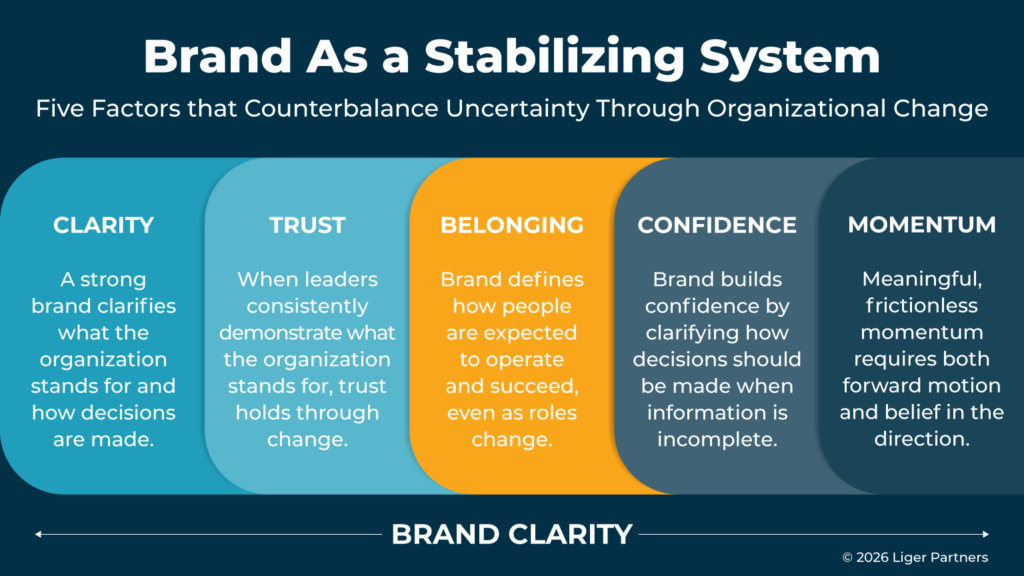 Done right, a strong brand provides employees, customers, and partners with stabilizing forces that absorb the impact of organizational change. These counterbalancing effects are far more tangible than many leaders realize.